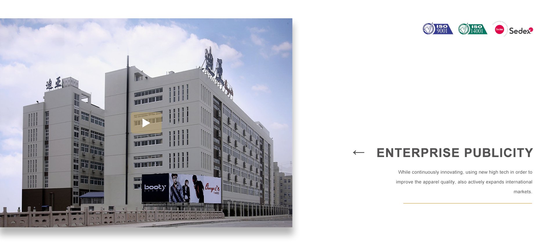 品牌建設是公司堅持不懈的追求,我們每年都會積極參加國內外舉辦的各大服裝展銷會。憑借著良好的質量與信譽,市場占有率在逐漸擴大,產品遠銷歐洲、美洲、亞洲等國。公司以生產棉衣、羽絨服、派克、大衣、夾克、運動休閑服飾等為主,旗下主打品牌有 ORANGE D’OR 、CLAIRVAL、BOOTY JEANS 、S&V和SASAEC,各品牌服飾均以典雅的色彩、優美的線條、卓越的魅力吸引著都市麗人,將時尚、經典的潮流信息予以淋漓盡致的演繹。